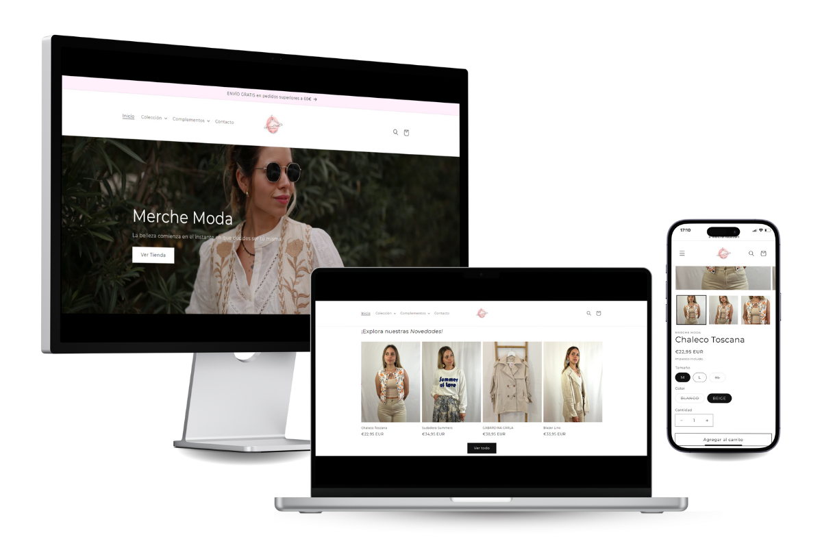 Trabajamos con Merche Moda, una tienda de ropa de mujer que destaca por su estilo y calidad. Diseñamos su página web y tienda online, capturando la esencia de su marca con una paleta de colores sofisticada y una navegación intuitiva. Ahora, Merche Moda puede conectar mejor con sus clientes y ofrecer una experiencia de compra única y agradable.